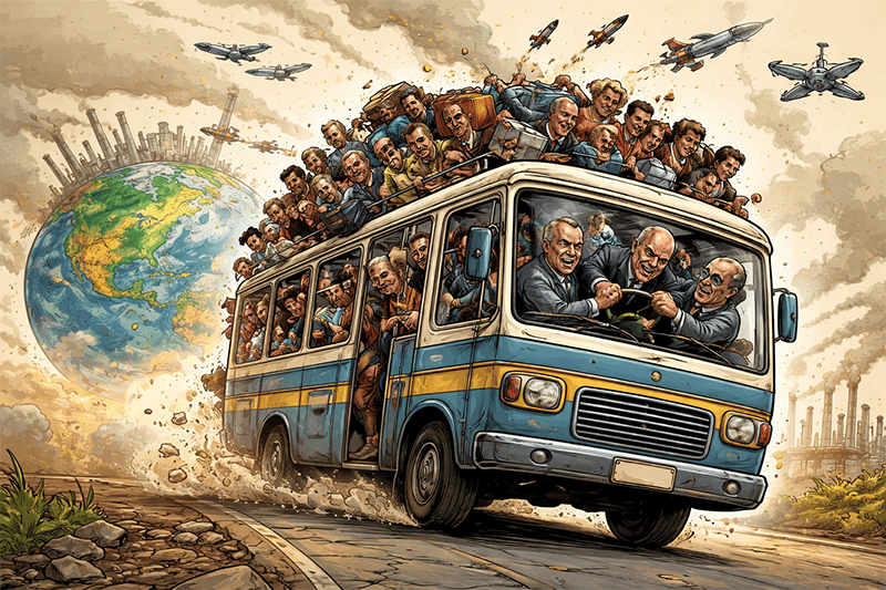 Francamente, essa nova ordem mundial não condiz com a vida real. O planeta hoje se parece com um ônibus lotado, avançando aos solavancos, movido a cotoveladas e asfixia. O ar cheira a óleo diesel, o calor é insuportável, há gente pendurada nos estribos e, para piorar, vários motoristas brigam pelo volante. Nenhum deles disposto a frear. Isso não tem como dar certo.