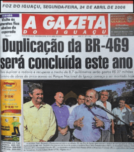 A cerimônia e seus derradeiros registros nos fazem viajar no tempo e, contar quantas voltas esse mundão “véio” dá. Na foto de capa do finado jornal A Gazeta do Iguaçu, o ministro do Planejamento, Orçamento e Gestão, Paulo Bernardo, faz o seu discurso e é ouvido pelos poderosos de então. Relembrando, estavam lá: Dilto Vitorassi, deputado federal, era suplente e assumiu a vaga do ministro Paulo Bernardo; Carlos Budel, presidente da Câmara Municipal; Reni Pereira e Chico Noroeste deputados estaduais; Paulo Mac Donald Ghisi, prefeito e ainda ao fundo, estava o deputado Fernando Giacobo. Se fossem patinhos no stand de tiro de um parque de diversões, só o Giacobo sobreviveria às rolhas ou chumbinhos. Mas todos ainda estão pela área, arriscando o voto.