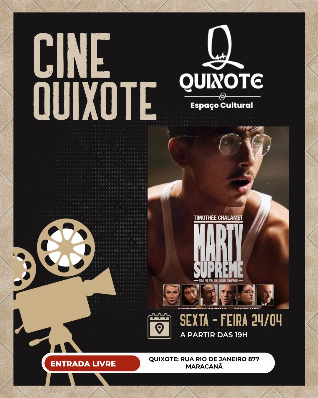 Para quem busca um programa cultural nesta sexta-feira, o Cine Quixote apresenta Marty Supreme, filme estrelado por Timothée Chalamet que acompanha a trajetória incomum de uma das figuras mais marcantes do esporte norte-americano.