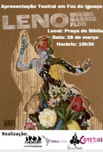 A Cia. Entre Fronteira e o Cote’coi de Foz do Iguaçu em parceria com a Cia. Ás de Paus, de Londrina, com o apoio da Universidade Federal da Integração Latino-Americana e do Sated-PR promovem a apresentação do espetáculo teatral LENO QUERIA NASCER FLOR no próximo sábado, às 10h30, na Praça da Bíblia (Foz do Iguaçu).