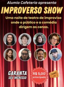 Às 20h30, o público poderá acompanhar uma apresentação de teatro de improviso com o grupo Improverso, que cria cenas espontâneas sem roteiro prévio, em um espetáculo leve, divertido e interativo. A entrada é simbólica: R$ 5.