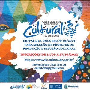 O Fundo Municipal de Incentivo Cultural segue buscando projetos artísticos para financiar com até R$ 35 mil em Foz do Iguaçu. O edital para a inscrição de interessados fica aberto até o dia 27 de outubro. Os recursos são geridos pelo Conselho Municipal de Políticas Culturais e Fundação Cultural.