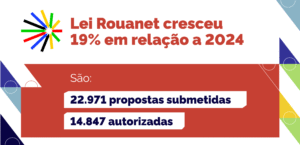 Neste exercício, foram recepcionadas 22.971 propostas culturais submetidas à Lei Rouanet. O volume representa um crescimento de 19% em relação às 19.291 de 2024 e um salto de 67% ante as 13.719 de 2023. Até o momento, 14.847 foram autorizadas pelo Ministério da Cultura e se tornaram projetos culturais aptos à captação.