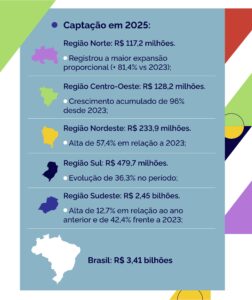 A região Norte apresentou o maior índice de expansão no país. O volume de recursos captados saltou de R$ 64,6 milhões em 2023 para R$ 117,2 milhões em 2025, um crescimento de 81,4% no período. Em relação a 2024, quando a região captou R$ 79,1 milhões, o aumento foi de 48,1%. O Centro-Oeste também registrou um salto significativo ao atingir R$ 128,2 milhões em 2025, valor 96% superior aos R$ 65,4 milhões de 2023. Na comparação anual com 2024, que teve R$ 122,7 milhões em captação, o crescimento foi de 4,4%.