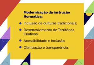 Otimização e transparência: o texto trouxe uma estrutura mais clara para a gestão e aprimora o monitoramento e a prestação de contas. O processo reforça a transparência no uso dos recursos públicos, com a obrigatoriedade de inserção das marcas do MinC e do Governo Federal em todas as peças de divulgação.