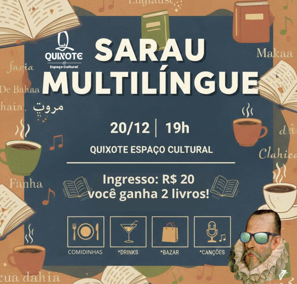 A diversidade de etnias, nacionalidades e idiomas que caracteriza a região trinacional será celebrada no Sarau Multilíngue, que acontece no sábado, 20 de dezembro, a partir das 19h, no Espaço Cultural Quixote. A proposta é valorizar a convivência entre diferentes culturas por meio da leitura, da música e da expressão artística em múltiplas línguas.