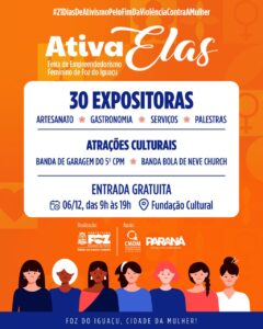 A Fundação Cultural de Foz do Iguaçu recebe, no próximo sábado (6 de dezembro), das 9h às 19h, a edição 2025 do Ativa Elas – Feira de Empreendedorismo Feminino. Realizado pela Secretaria Municipal da Mulher, o evento integra a campanha dos 21 Dias de Ativismo pelo Fim da Violência contra a Mulher e tem como objetivo fortalecer a autonomia econômica feminina, fomentar a geração de renda e valorizar iniciativas lideradas por mulheres no município.