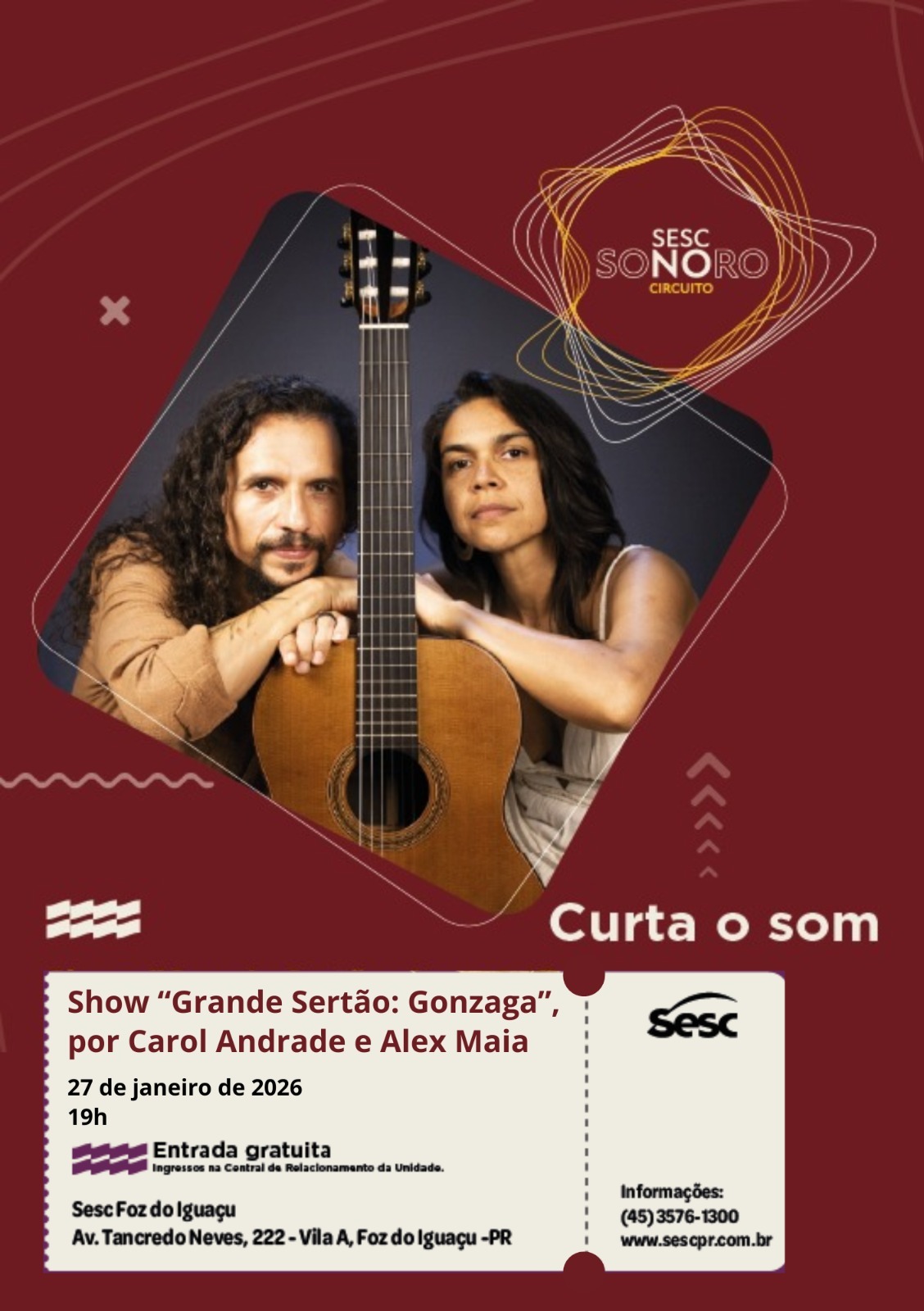 O Sesc Foz do Iguaçu promove, nesta terça-feira, o show “Grande Sertão: Gonzaga”, espetáculo que marca a abertura da programação cultural da unidade e integra o projeto Sesc Sonoro. A apresentação é gratuita e acontece hoje, reunindo música e literatura em uma proposta artística sensorial e poética.
