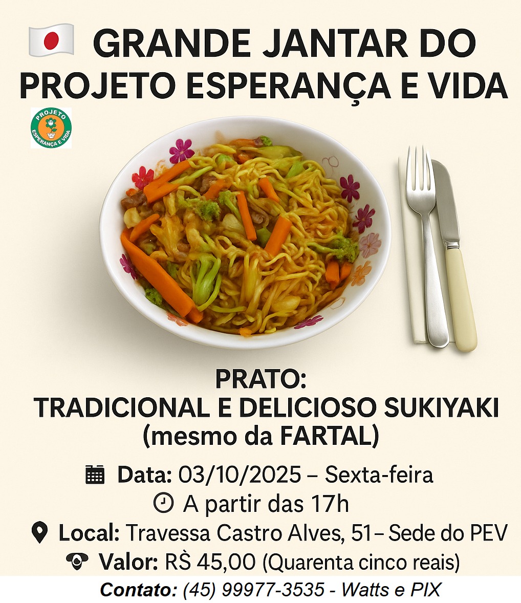 A Associação Rainha da Paz – Projeto Esperança e Vida promove o tradicional sukiyaki da entidade, nesta sexta-feira, 3, a partir das 17h, em sua sede, localizada na Travessa Castro Alves, nº 51.