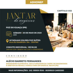 Com mais de 29 anos de experiência profissional na área de estudos elétricos, Alecio Barreto Fernandes será o palestrante do jantar que ocorrerá no sábado dia 20 de maio, em Foz do Iguaçu, promovido pela Adhonep, associação que reúne homens e mulheres com objetivo de refletirem sobre princípios. O evento é sem fins lucrativos. O presidente do capítulo da Adhonep em Foz é Rodrigo Luiz Cardoso, empregado da Itaipu Binacional. “Será uma excelente oportunidade de crescimento e networking, sendo um evento aberto a toda sociedade”, salienta Cardoso.