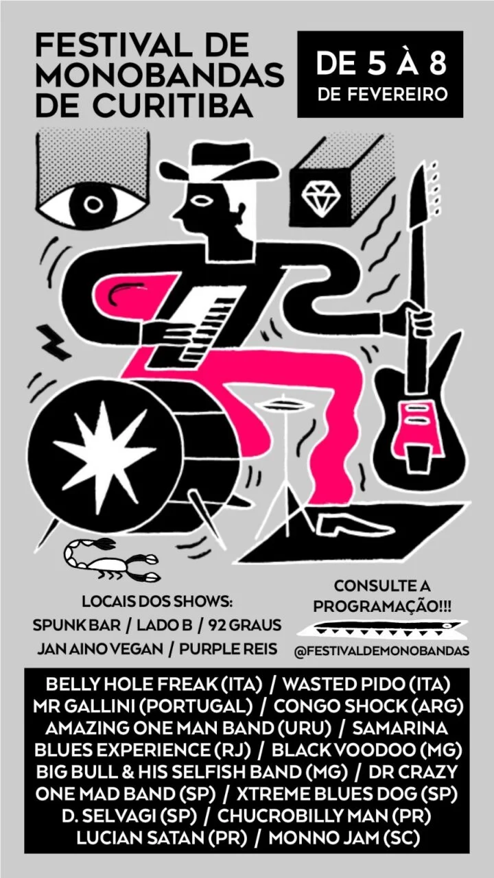 A programação do festival segue até domingo (08/02) em diversos pontos da capital paranaense, como Spunk, Janaíno Vegan, 92 Graus, Lado B e Purple Reis, com atrações que vão do blues ao rock psicodélico, sempre com o conceito de “one man band” no centro. A apresentação de abertura de Lucian Satan é gratuita e começa às 19h.