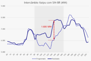 Ao longo do dia, até a recuperação completa do sistema, o fornecimento de energia da Itaipu ao SIN-BR permaneceu em média 900 MW superior ao programado para o período. O aumento do despacho de energia começou às 9 horas, quando Itaipu passou dos 6.050 MW planejados para cerca de 6.500 MW. A maior diferença ocorreu às 13h30, quando o fornecimento ao sistema brasileiro ficou em torno de 1.600 MW acima do planejado.