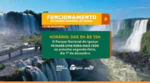 O Parque Nacional do Iguaçu — palco das Cataratas, um dos espetáculos naturais mais impressionantes do planeta — funcionará em horário especial na próxima segunda-feira, 1.º de dezembro. De forma excepcional, a visitação ocorrerá das 9h às 15h, por ajustes operacionais. O último embarque no transporte interno será às 15h e o retorno final, às 16h30.