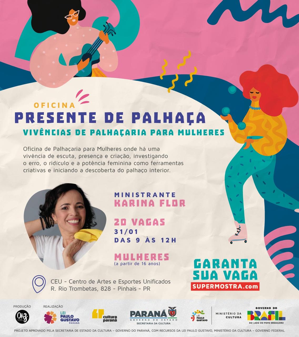 Mulheres a partir de 16 anos poderão vivenciar uma experiência artística voltada à expressão, ao riso e ao fortalecimento da identidade feminina na oficina “Presente de Palhaça – Vivências de Palhaçaria para Mulheres”, que será realizada no dia 31 de janeiro, das 9h às 12h, no CEU – Centro de Artes e Esportes Unificados, em Pinhais, na Região Metropolitana de Curitiba.