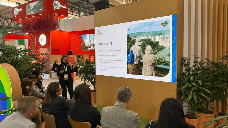 A participação integrou o estande do Brasil, promovido pela Embratur, e contou com uma mesa de trabalho, uma agenda de 40 atendimentos e duas apresentações oficiais do destino, ampliando a visibilidade de Foz do Iguaçu e fortalecendo a geração de novos negócios para o turismo de eventos.